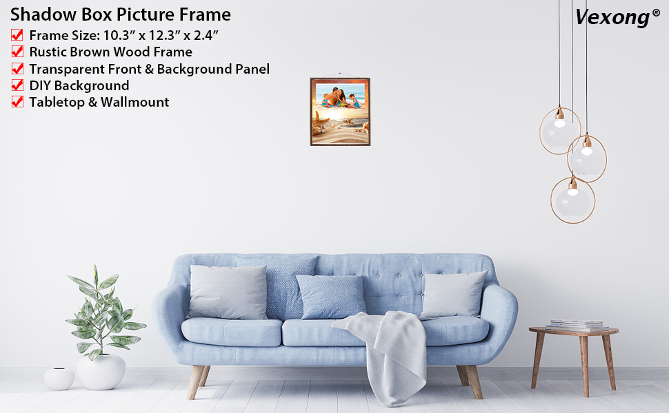 The size of this shadow box frame is 10.3″ (26.2 cm) x 12.3″ (31.2 cm) x 2.4″ (6.1 cm). It’s rustic brown wood frame with clear acrylic boards of front and background. The product can be used as display case, picture box, memory boxes, display box, memorial gifts, sympathy gift, memory frame, magazine frame, and flag holder. It’s perfect for creating and protecting your display of photos, models, specimens, and any other memorabilia.