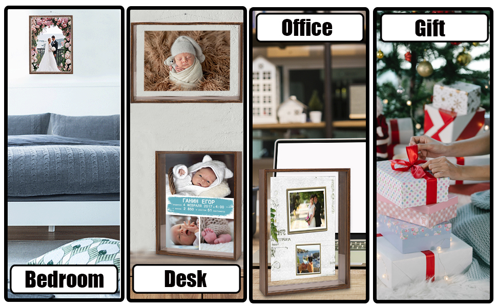 This deep shadowbox comes with hanging hardware for hassle-free display horizontal or vertical on the wall. It can also be placed on a desktop, tabletop, countertop, or mantel. The frame depth allows to display pictures, photos, medals, animal and plant specimens. This display frame can be photo box, flag display case, baby memory box, pet memorial shadow box, flower box, book display case, newspaper frame, 3D picture frame as well.